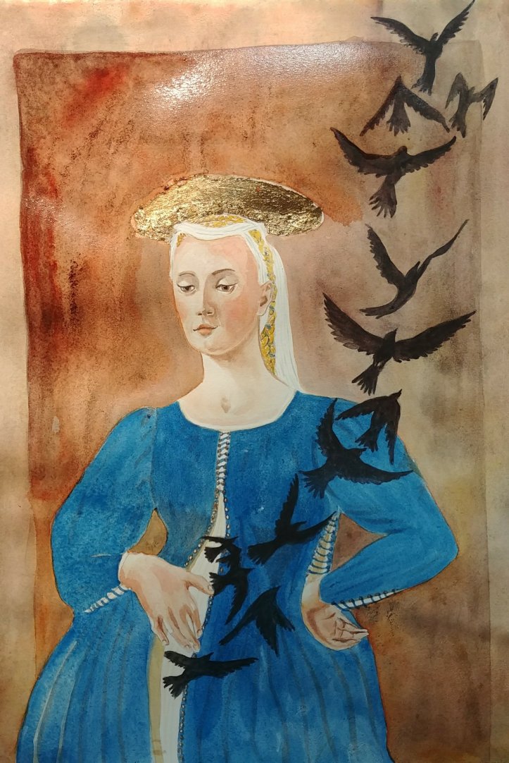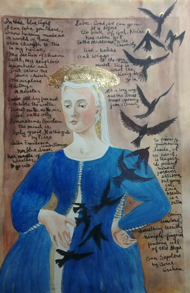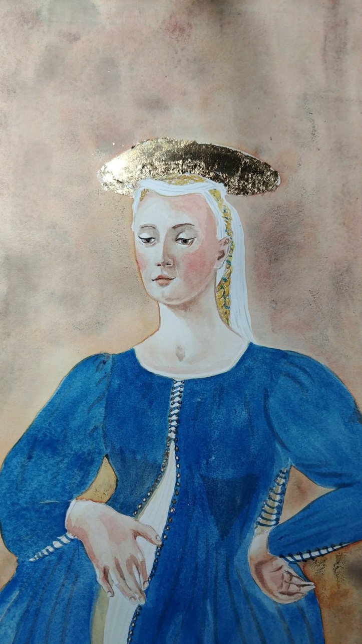 Unbeknownst to me about her significance, I chose to recreate “Madonna del Parto” because I liked her face and the position of her hands but rather than paint her buon fresco, I did so with watercolor.